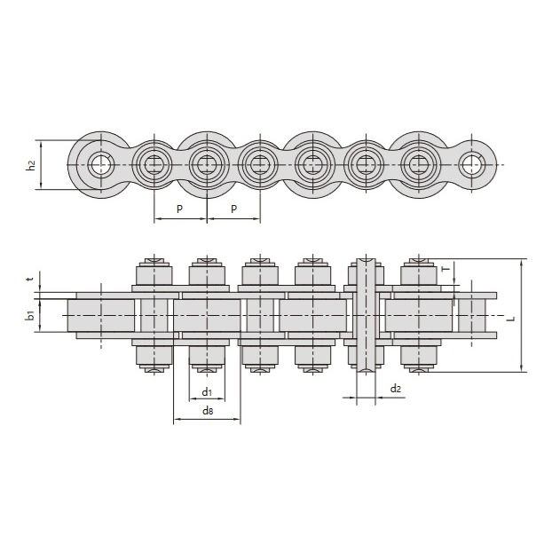 • Design med store og små ruller:Den første rulle har en diameter, der er større end højden på den indre kædeplade, hvilket eksponerer dens ydre overflade ud over enden af kædepladen. Den anden rulle er mindre, med en diameter, der er mindre end højden på den indre kædeplade.