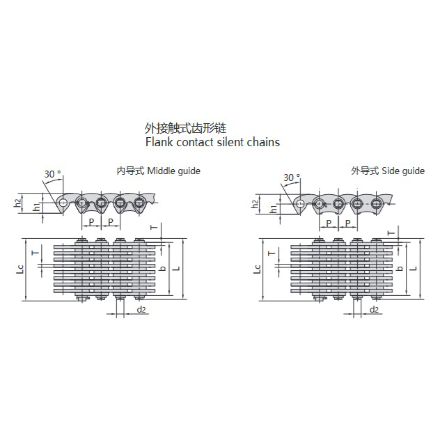 - Indvendigt-udvendigt indgrebet tandkæde:Kombinerer fordelene ved indvendig og udvendig indgreb. Ideel til høje hastigheder, variable hastigheder og variable belastningsforhold. Minimerer polygonale effekter, stød, vibrationer og støj, samtidig med at transmissionseffektiviteten øges.
