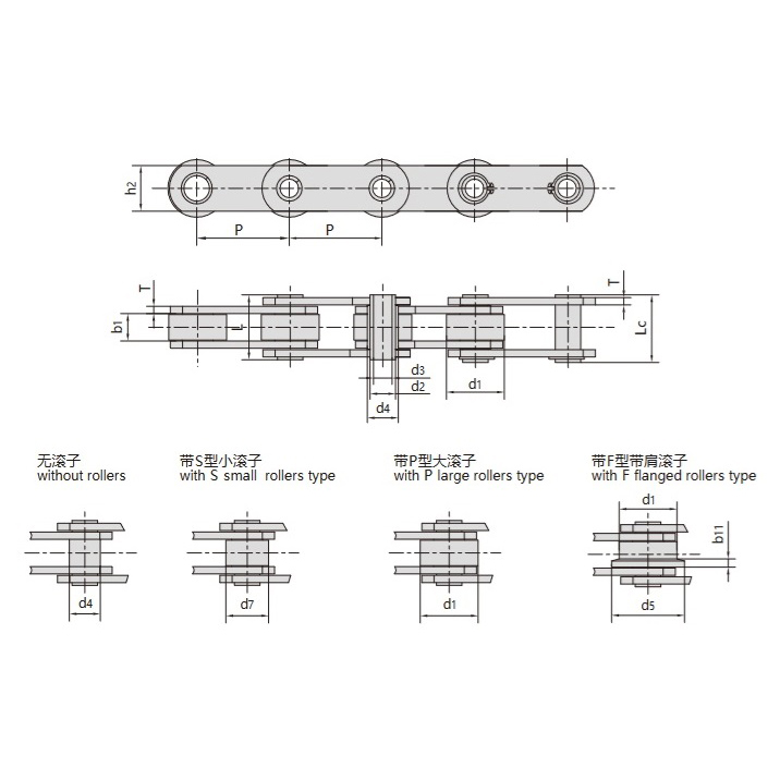 - Fås i et rulleløst design eller udstyret med S-type små ruller, P-type store ruller og F-type skulderruller til forskellige transmissionsbehov.