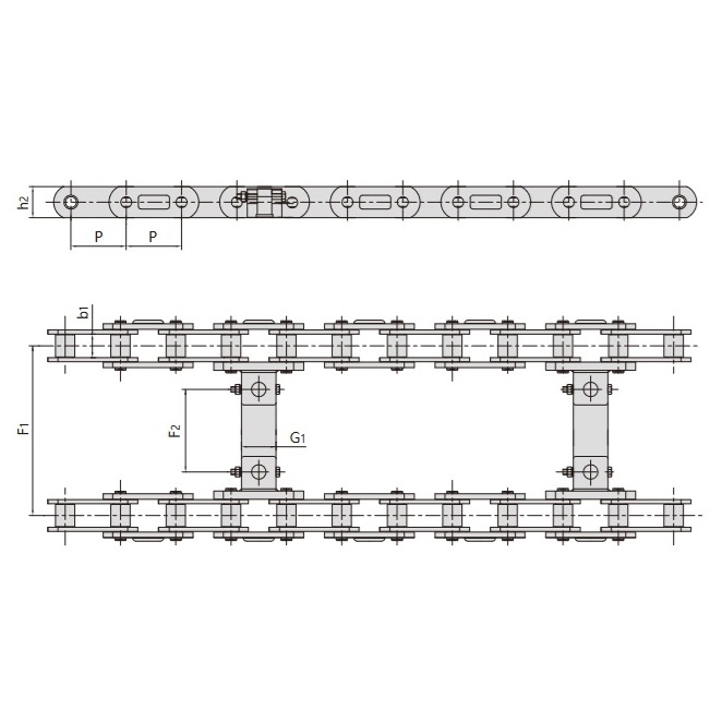 - Anden indre kædeenhed:To modstående indre kædeplader, en integreret monteringsplade, overgangsplade, forbindelsesplade og ruller mellem monteringspladerne.